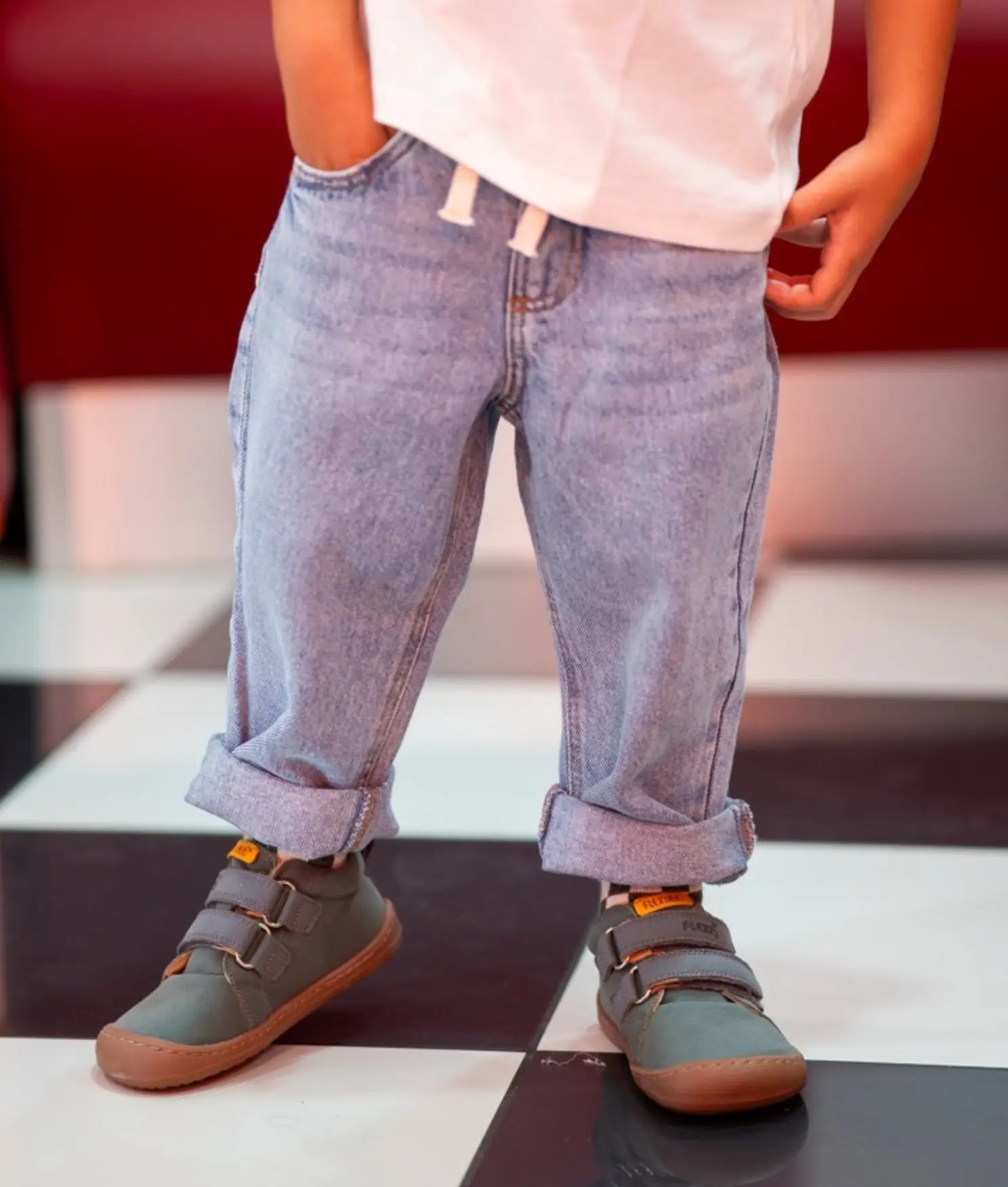 Chaussures Barefoot 100% cuir couleur beige clair de la marque Espagnole Flexi Nens, avec une double fermeture velcro conçues selon le concept pieds nus, sans dénivelé, bout renforcé, souples et avec semelle en cuir amovible.