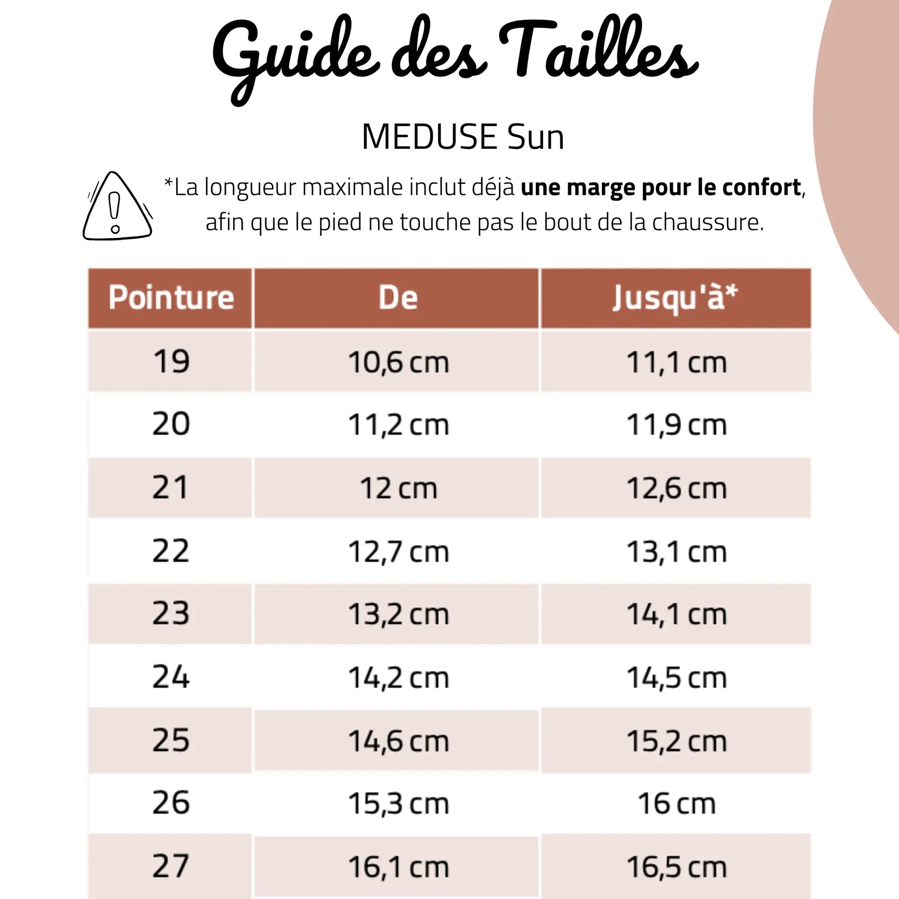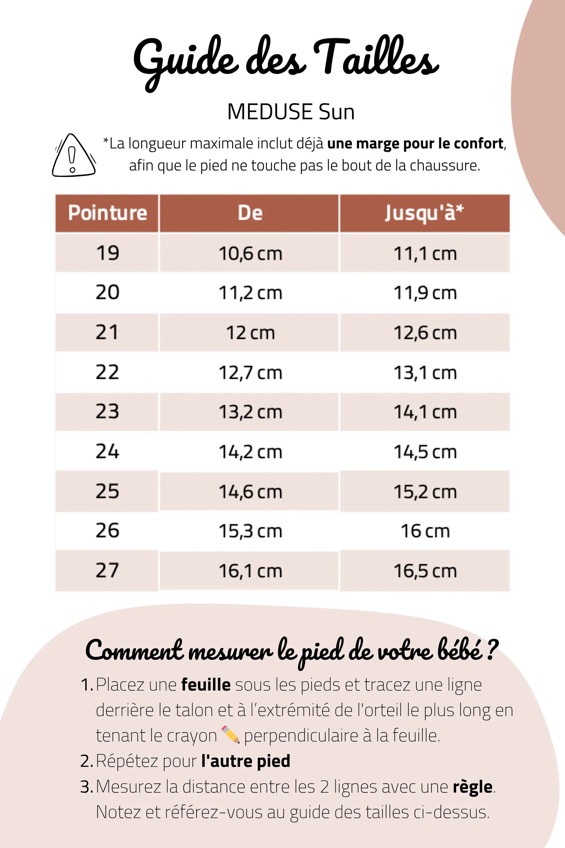 - ✏️ Notez les mesures obtenues en cm pour chaque pied et référez-vous au guide des tailles.