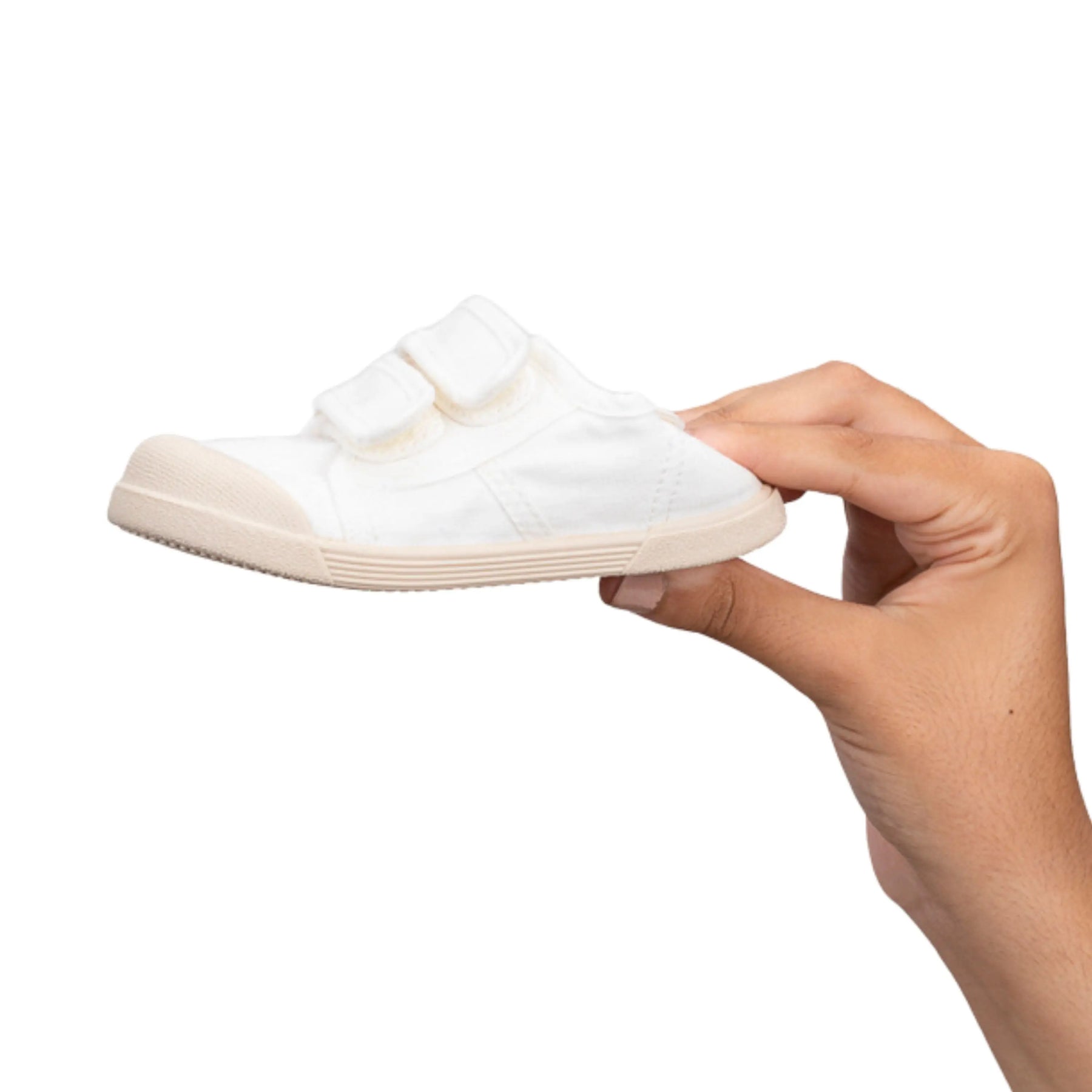 Chaussures Barefoot en toile de coton 100% couleur blanc, avec une double fermeture velcro conçues selon le concept pieds nus, sans dénivelé, flexibles, souples et avec semelle amovible. Laver à l'eau froide sans la semelle intérieure.