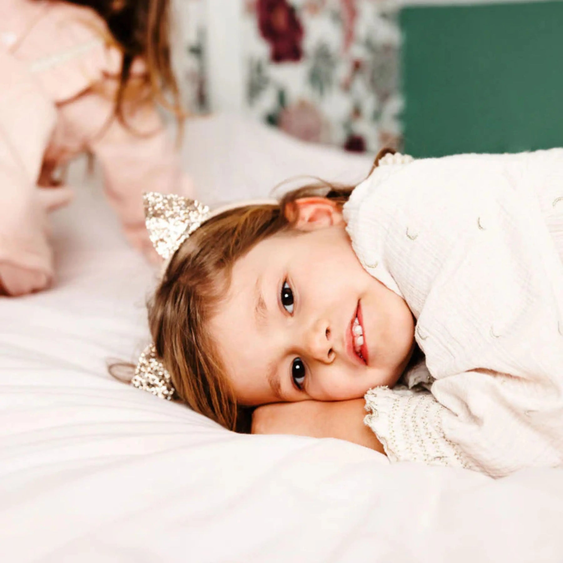 Ce serre-tête chat doré Luciole et petit pois maintient les cheveux des petites avec facilité et une touche d’élégance.